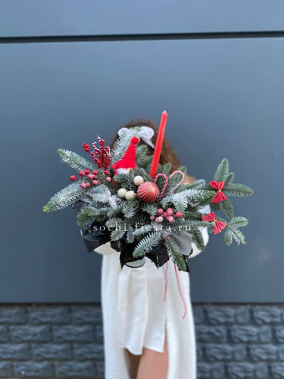 Бокал становится основой для композиции, где нобилис и праздничные игрушки образуют плотную структуру. Свечи завершают форму, а красный тон задаёт яркое звучание всему решению.
