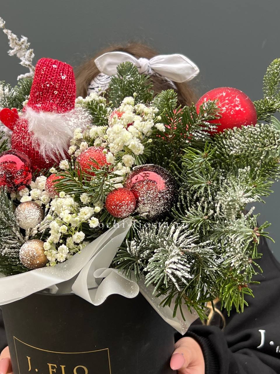 датский нобилис,  гипсофилы, красные игрушки, гном, шары, аспарагус (или аналог), сосульки ВНИМАНИЕ! Готовая композиция (декор) может иметь незначительные внешние отличия от примера на фотографии.