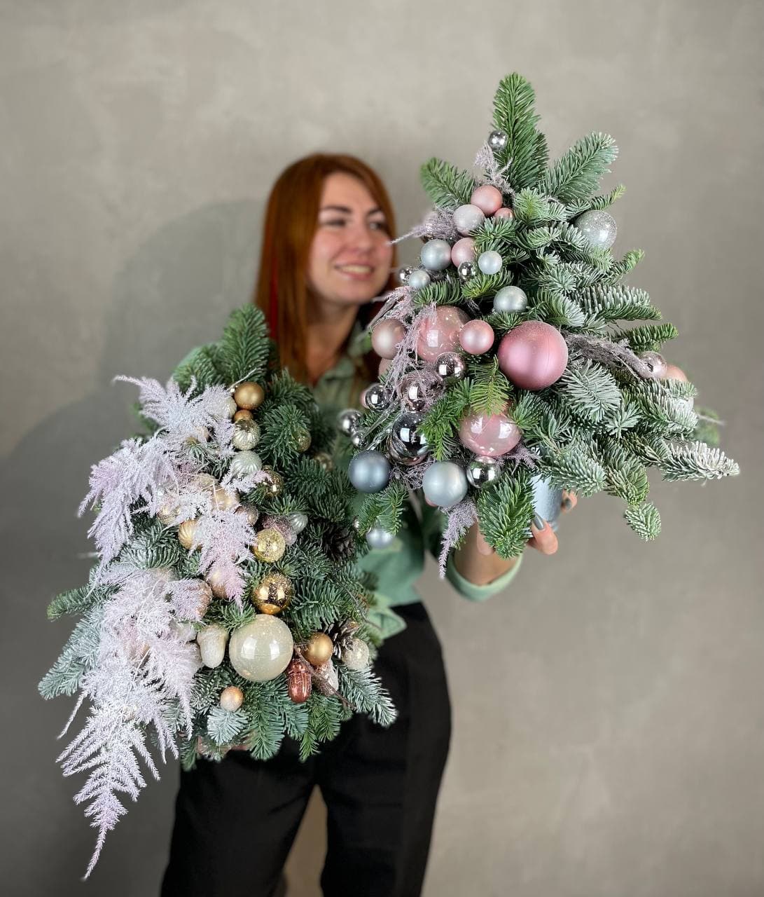 датский нобилис, аспарагус, кашпо, оазис, новогодние игрушки, декор ВНИМАНИЕ! Готовая композиция (декор) может иметь незначительные внешние отличия от примера на фотографии.