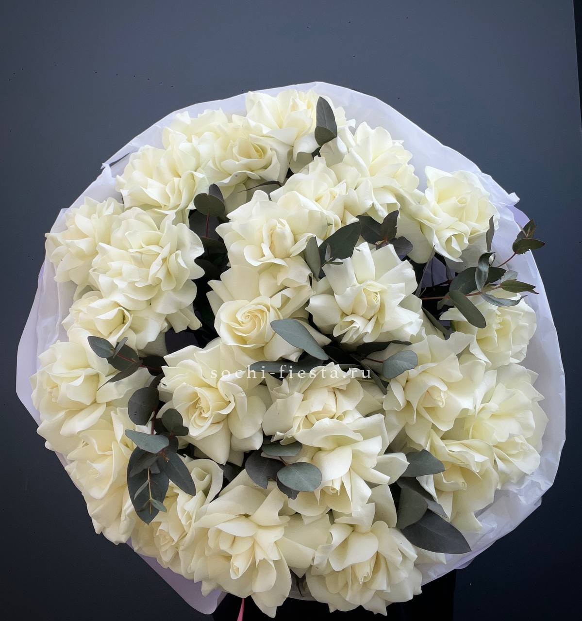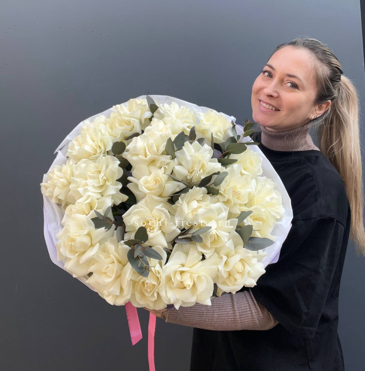 розы пионовидного сорта с эвкалиптом в нежном оформлении.