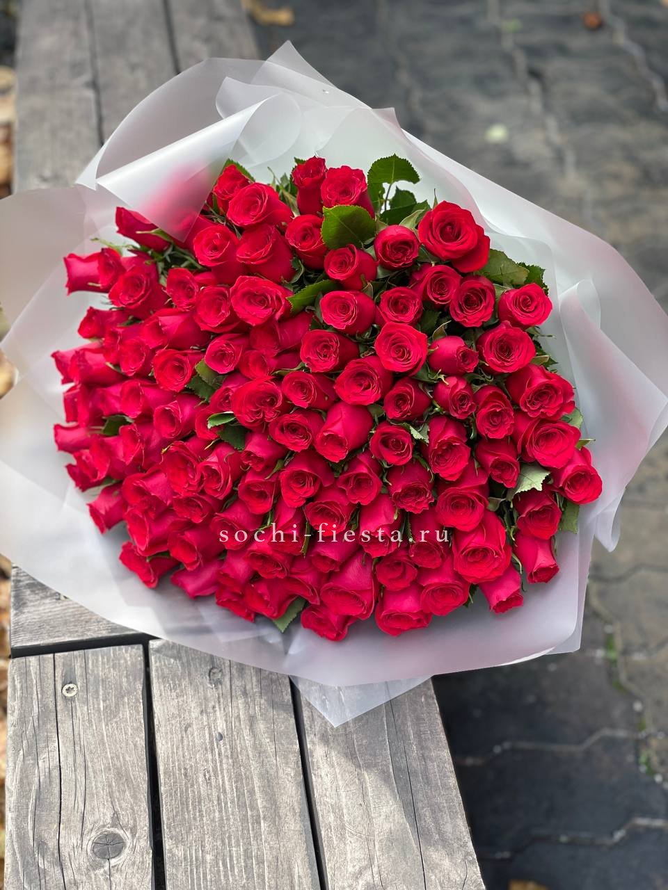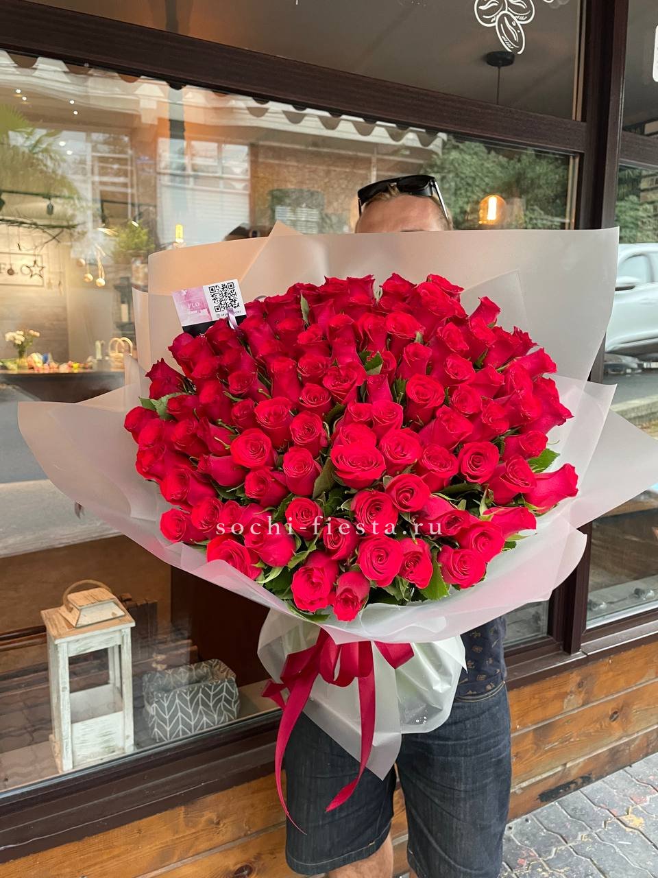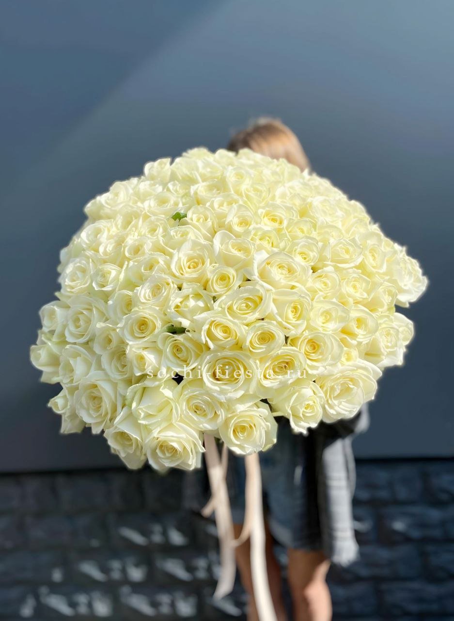 Сто одна белая роза собрана в впечатляющую охапку. Монохромная гамма и повторяющийся ритм бутонов создают мощное визуальное присутствие. Такой объём заполняет пространство и приковывает внимание.
