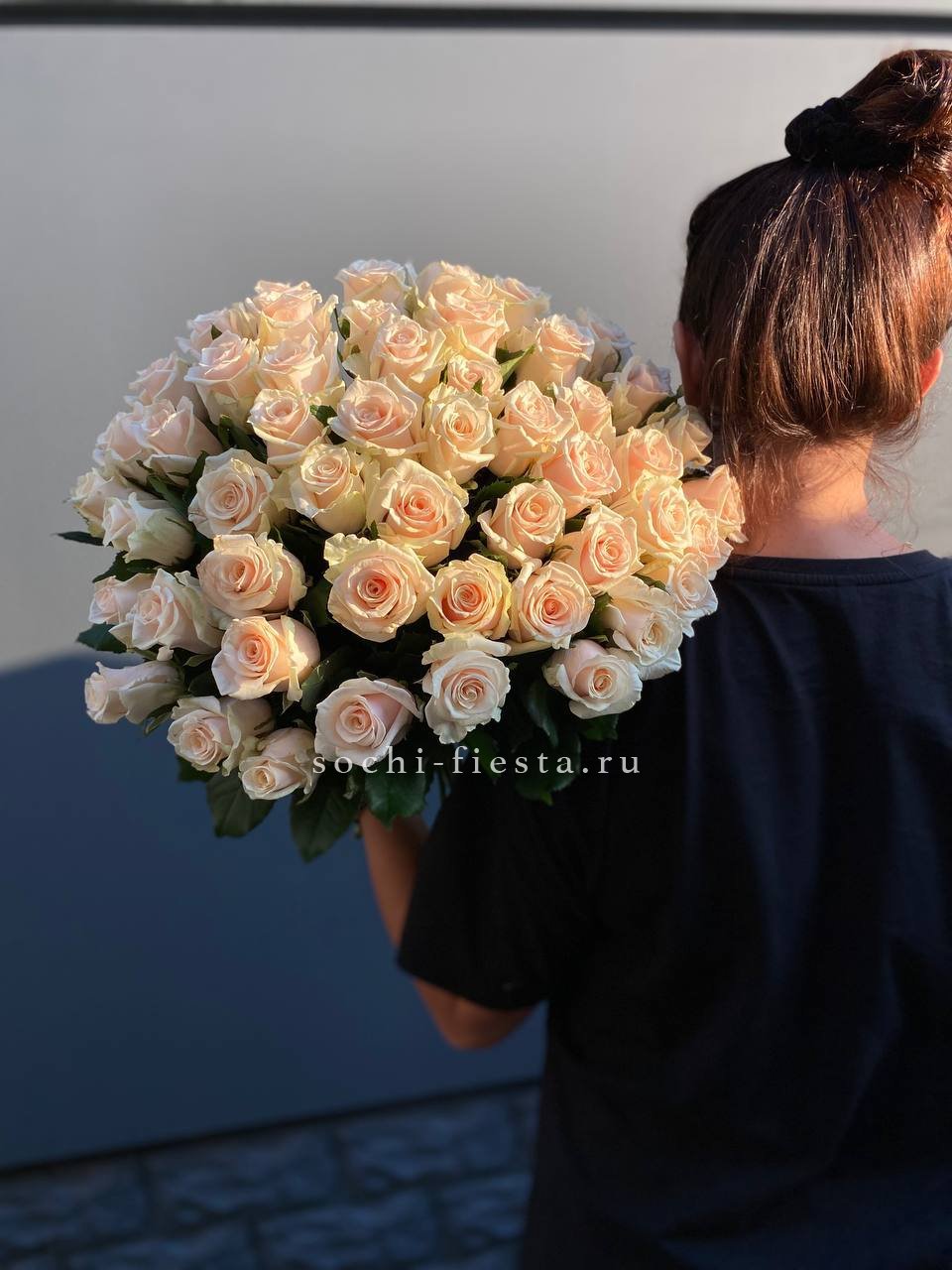 Плотная охапка кремовых роз с мягким переходом оттенков от сливочного до топленого молока. Бутоны собраны без зазоров, образуя округлую форму с естественным объемом. Атласная лента фиксирует стебли и завершает композицию.