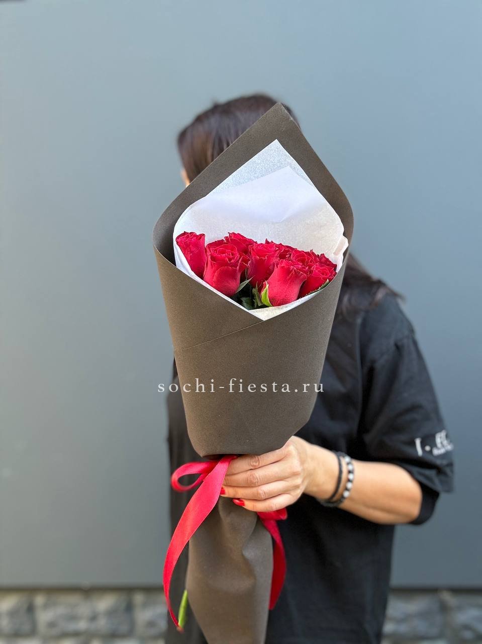 Пять алых бутонов собраны в лаконичную вертикальную форму. Серебристый эвкалипт добавляет воздуха между стеблями. Минималистичная подача для тех, кто ценит сдержанность.