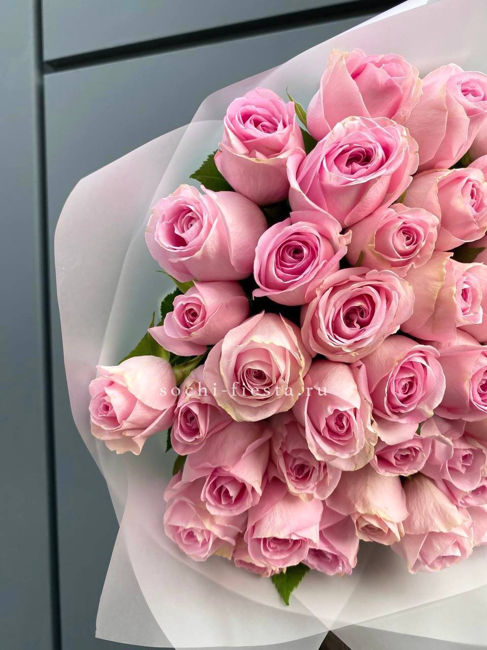 роза розовая - 101 шт., лента, белая дизайнерская бумага.