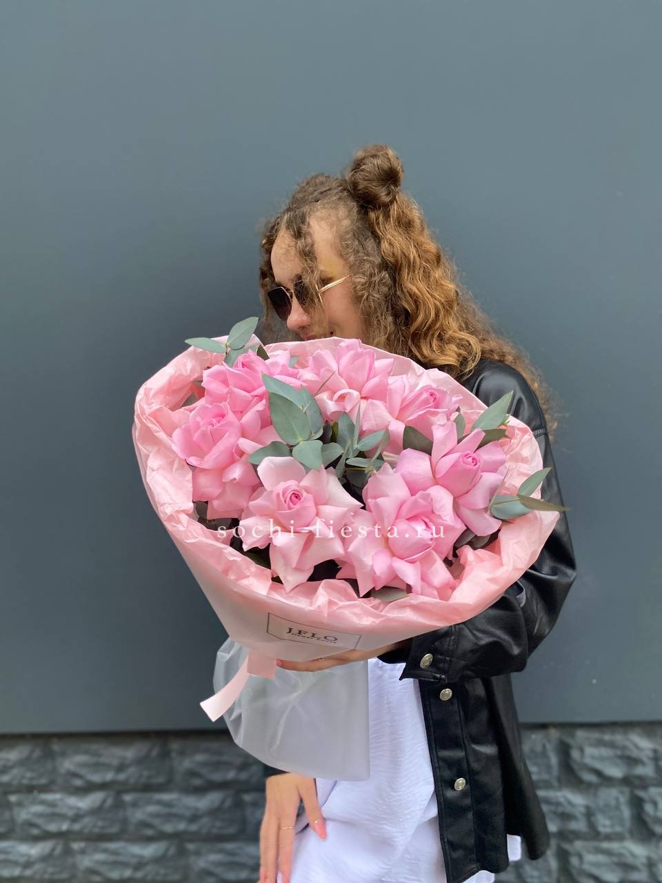 Семь вывернутых роз образуют компактную группу с чистым силуэтом. Ветки эвкалипта задают вертикальный ритм и добавляют воздуха между бутонами. Букет держит форму и выглядит собранно.