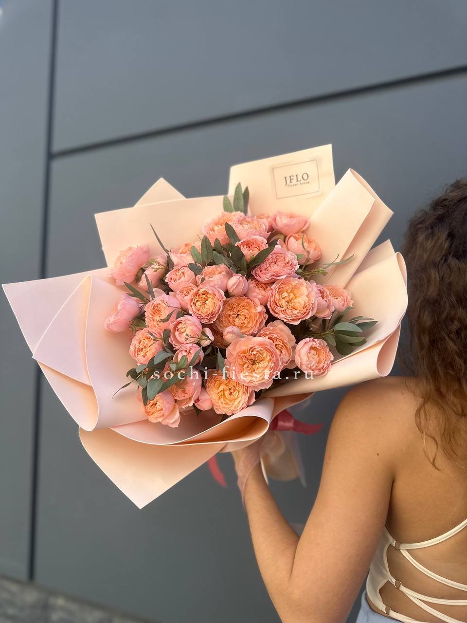 Одиннадцать веток пионовидной розы окружены серебристой зеленью эвкалипта. Фактура многослойных лепестков раскрывается на фоне матовой листвы. Букет дышит и сохраняет объём.