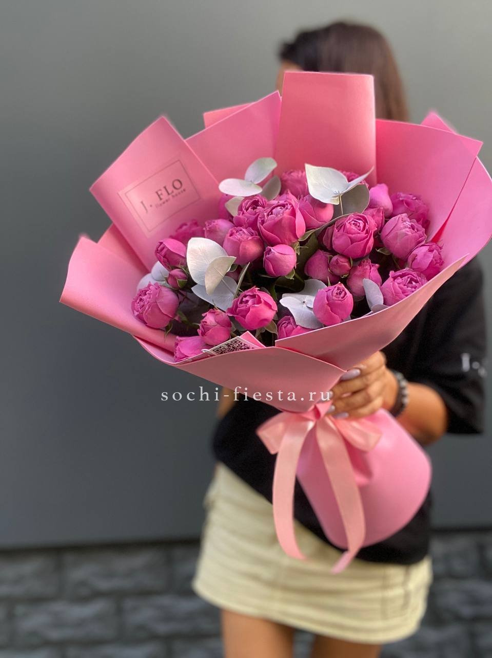 Пятьдесят одна ветка пионовидных кустовых роз Мисти Баблс дополнена эвкалиптом и хаммелациумом. Многослойные бутоны раскрываются пышными шапками в лавандово-розовой гамме. Воздушная зелень добавляет движение и свежесть всей композиции.