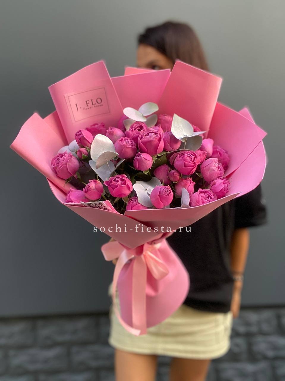 пионовидная кустовая роза Мисти Баблс - 51 шт., эвкалипт 5 шт., хаммелациум (или аналог), лента, дизайнерская упаковка.