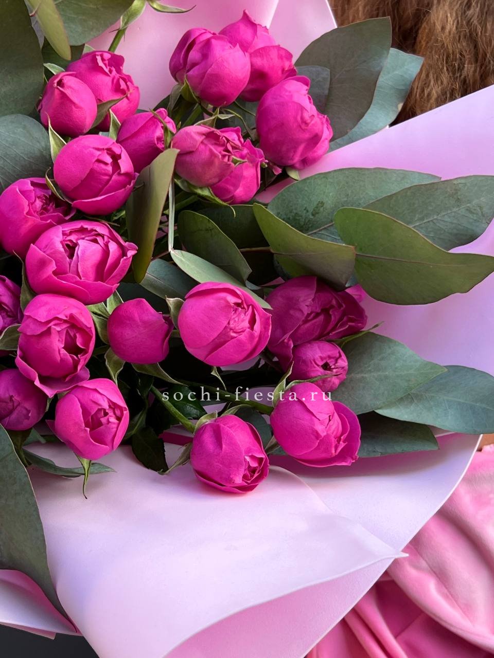 Пионовидные розы с густыми округлыми бутонами в окружении серебристого эвкалипта. Плотная сборка и мягкая палитра создают впечатление спокойной гармонии.