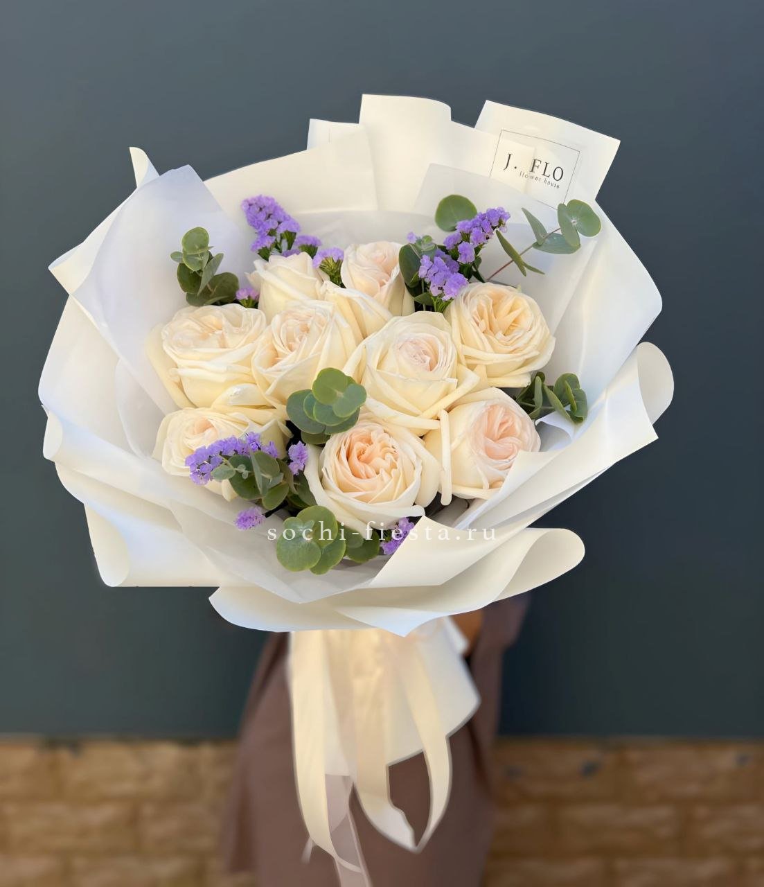 Девять белых роз White O'Hara дополнены статицей и эвкалиптом для воздушности. Многослойные лепестки раскрываются постепенно, создавая глубину и объем в компактной форме.