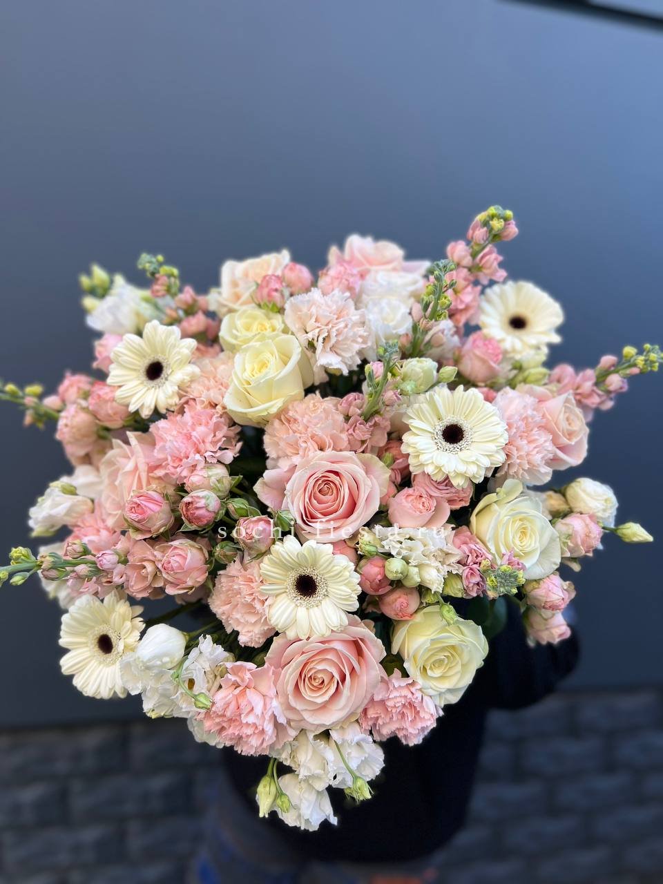 Герберы вспыхивают между пышными бутонами эустомы и маттиолы, создавая игру открытых и закрытых форм. Диантус с бомбастиком заполняют пространство свежими оттенками.