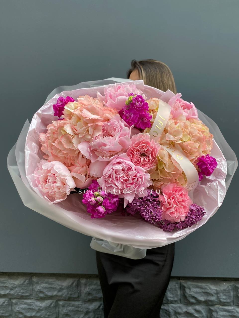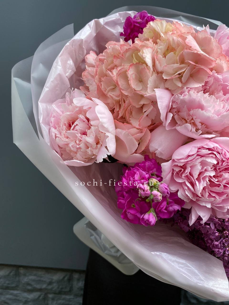 пионы, гортензии, диантусы, маттиола лента и дизайнерская пленка.