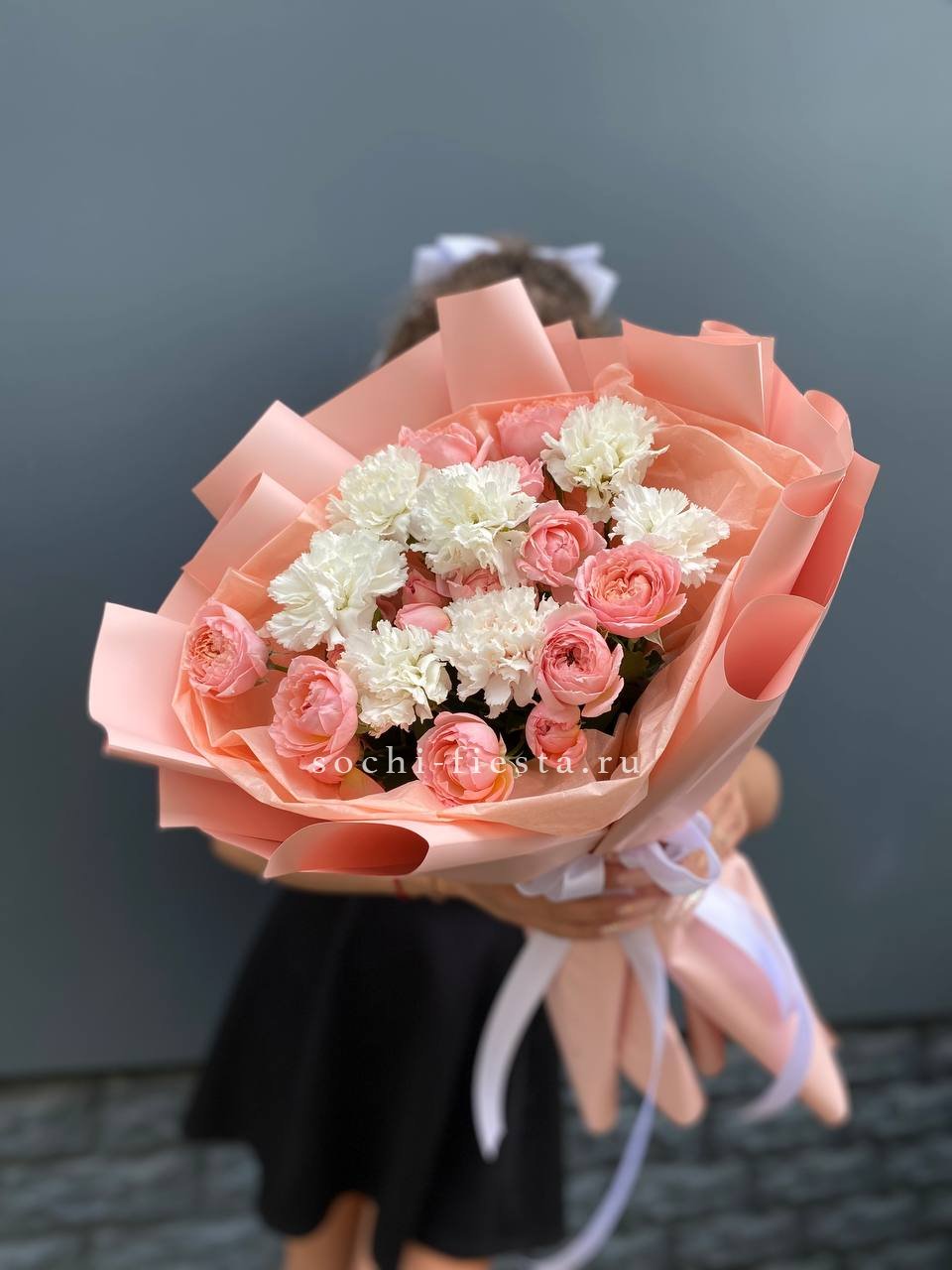 кустовые розы Джульетта и диантусы в нежном оформлении.