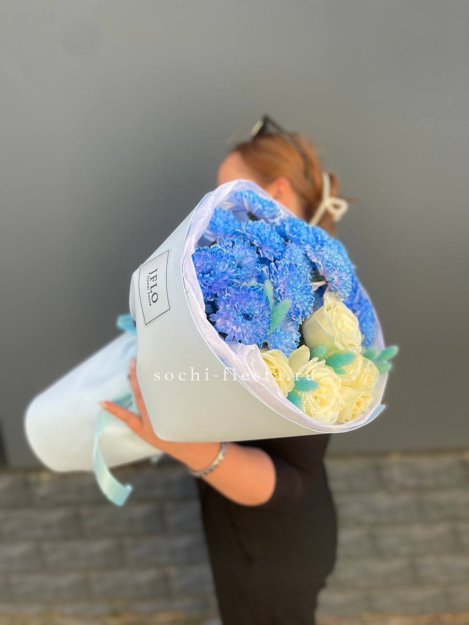 Воздушные соцветия лагуруса создают мягкую дымку вокруг роз и хризантем. Букет собран с ощущением лёгкости и простора, словно морской бриз коснулся каждого лепестка.