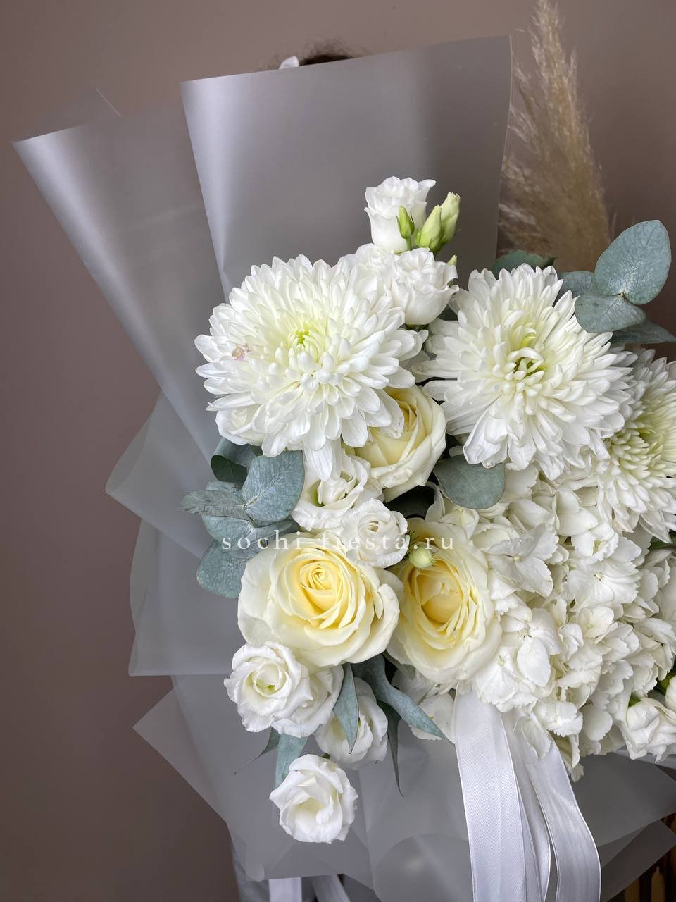 гортензия, хризантема, роза, эустома, упаковка, лента.