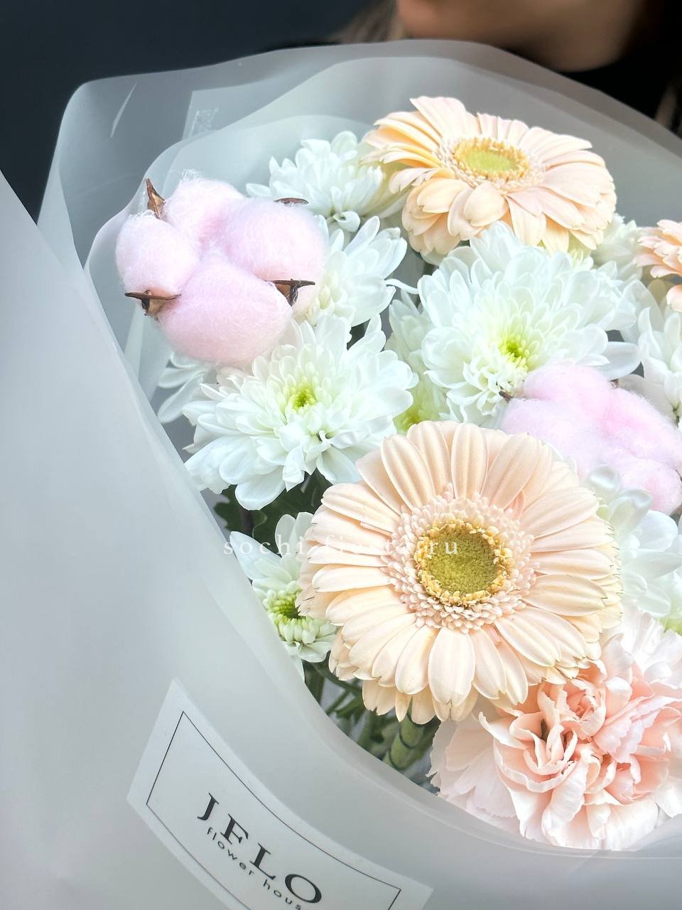 Яркие герберы и пушистый хлопок собраны в компактную форму. Композиция выглядит свежо и держит структуру, удобно размещается в вазе любого формата.