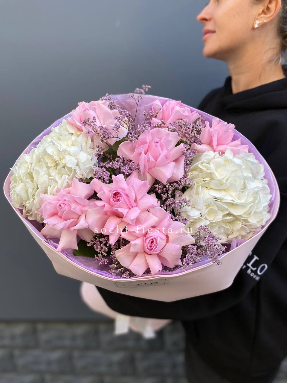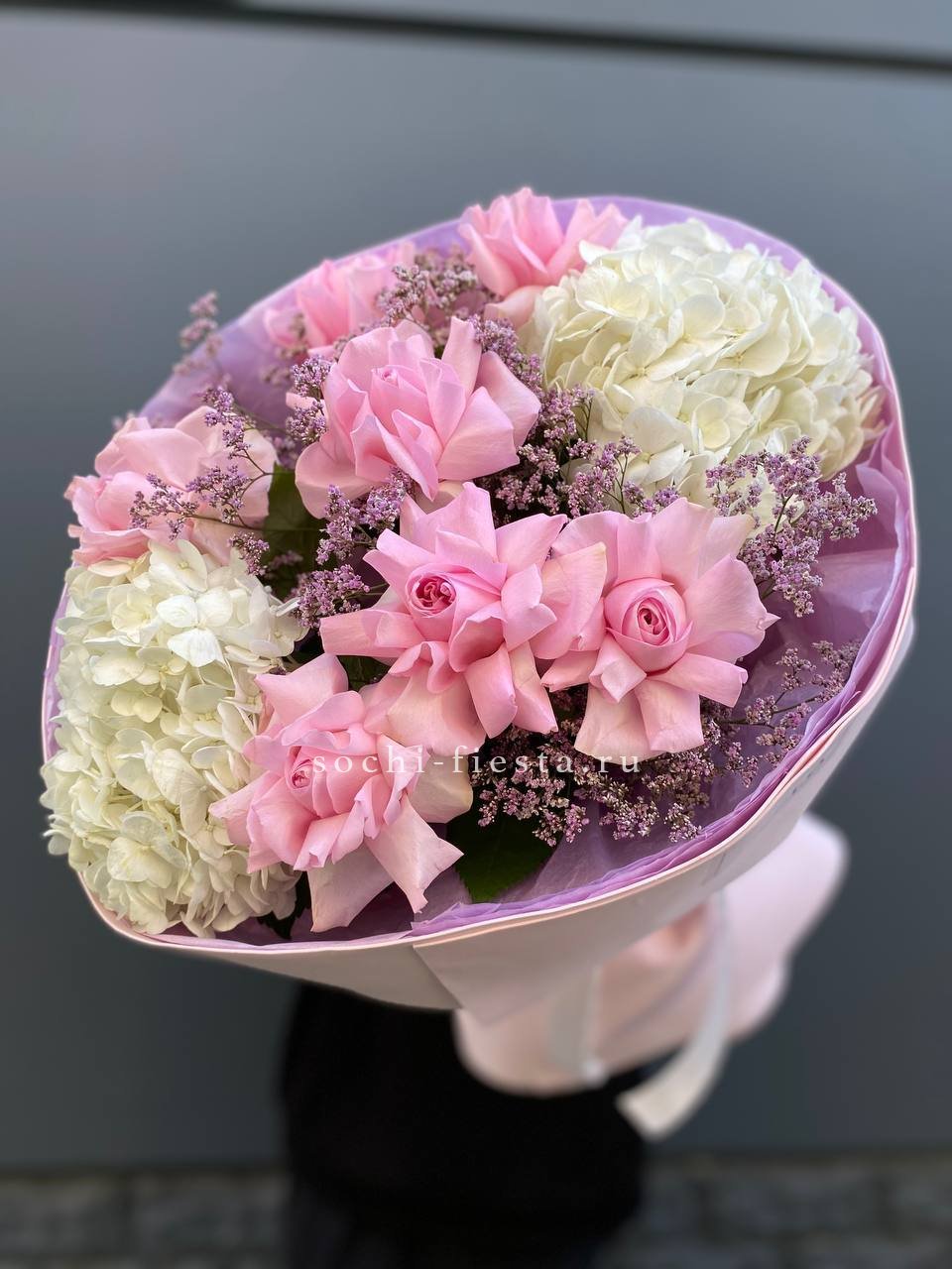 Воздушная композиция с крупными соцветиями гортензии и пышными розами создает ощущение легкости и объема. Эвкалипт добавляет свежести, а бомбастик расставляет яркие акценты между бутонами.