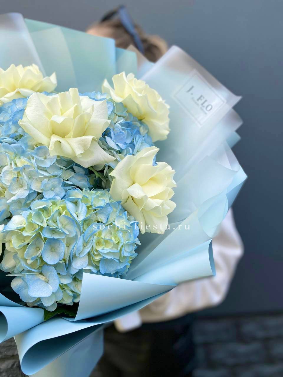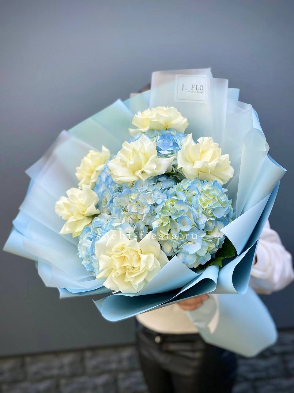 хризантема кустовая, гортензия, мисти баблс, розы в нежном оформлении.