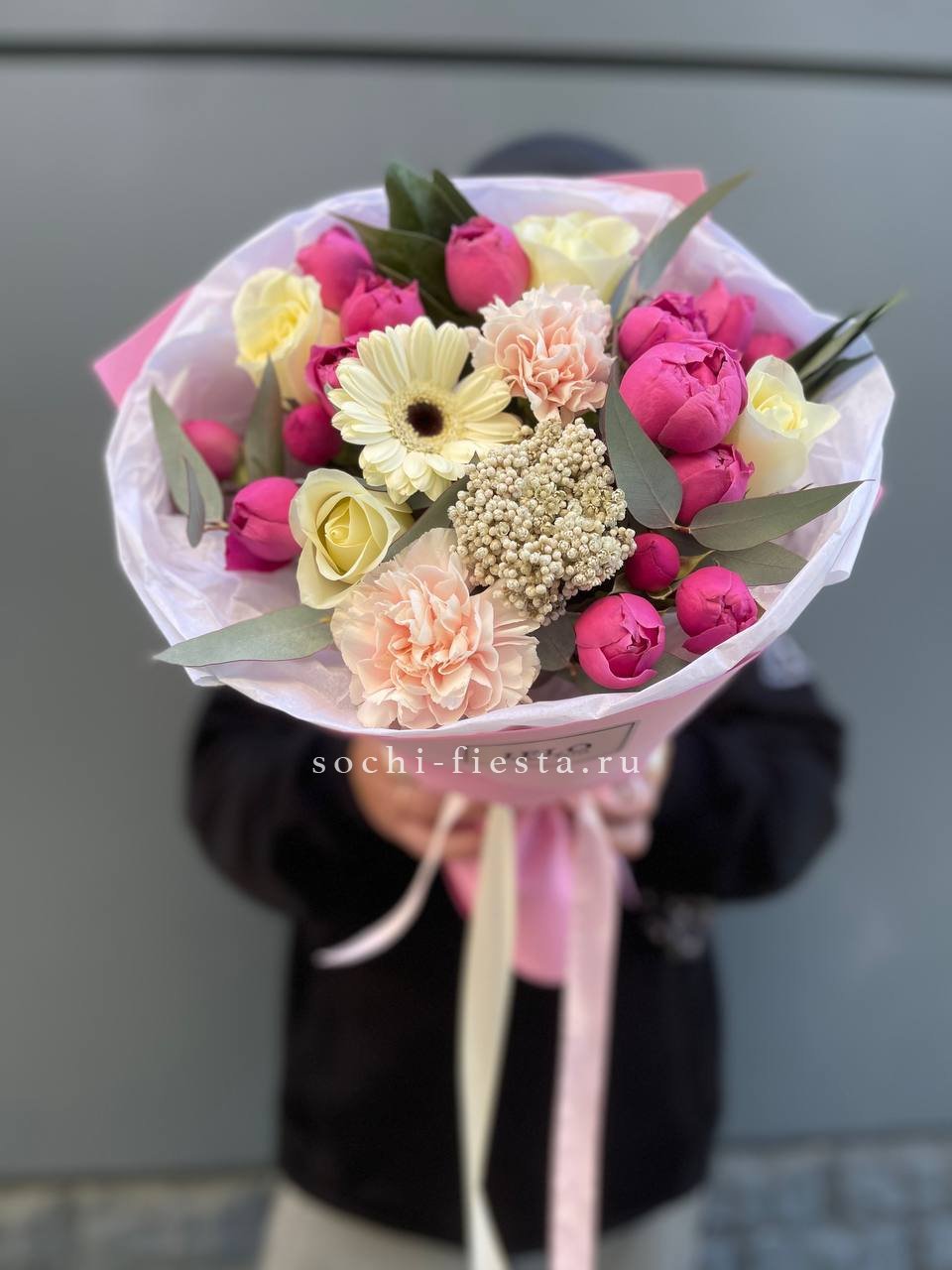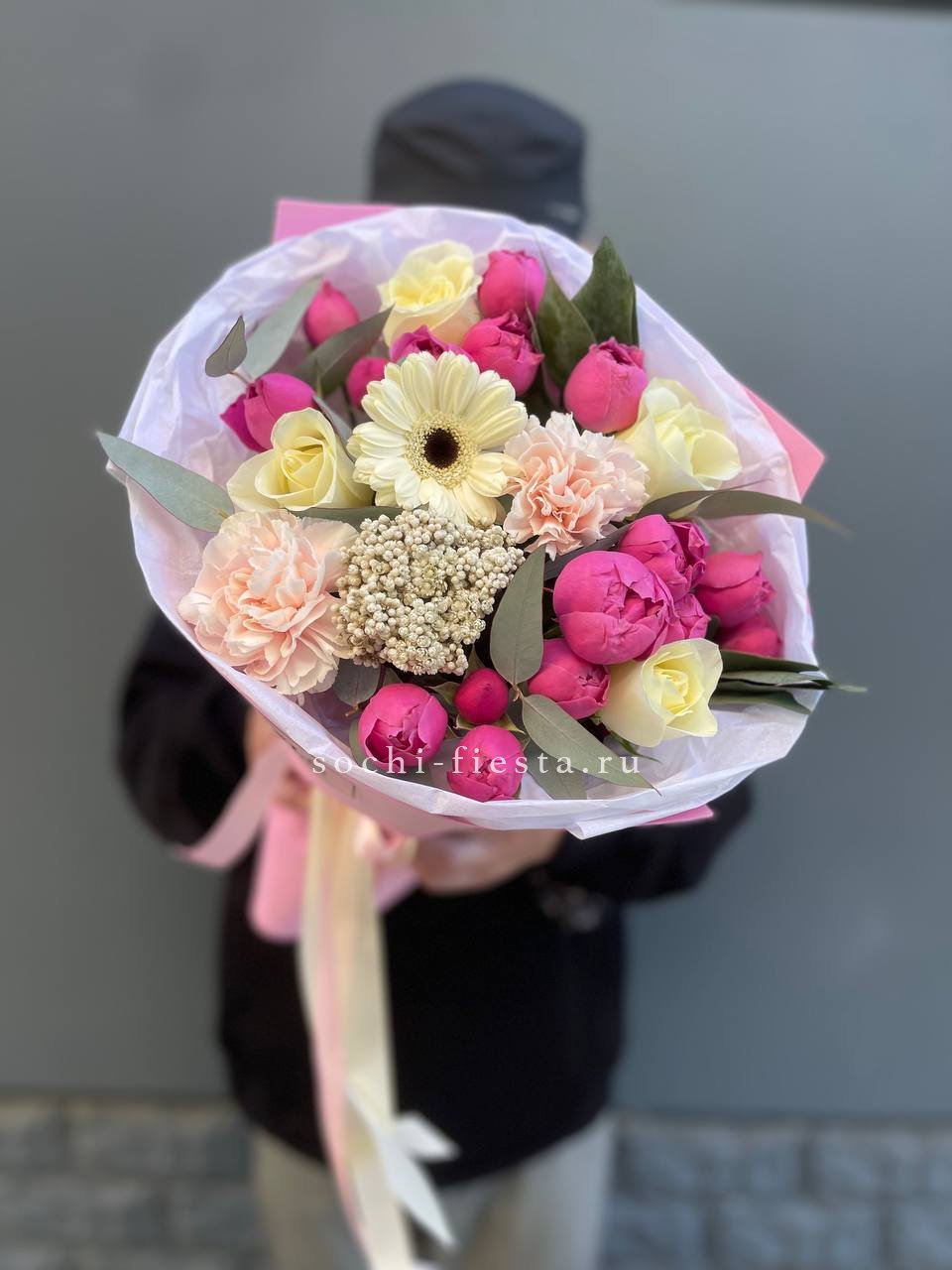 Воздушная композиция в пастельных тонах с пионовидными розами и гортензией создает объемную форму. Каждый бутон раскрывается слоями, а диантусы добавляют графичные точки среди крупных соцветий.