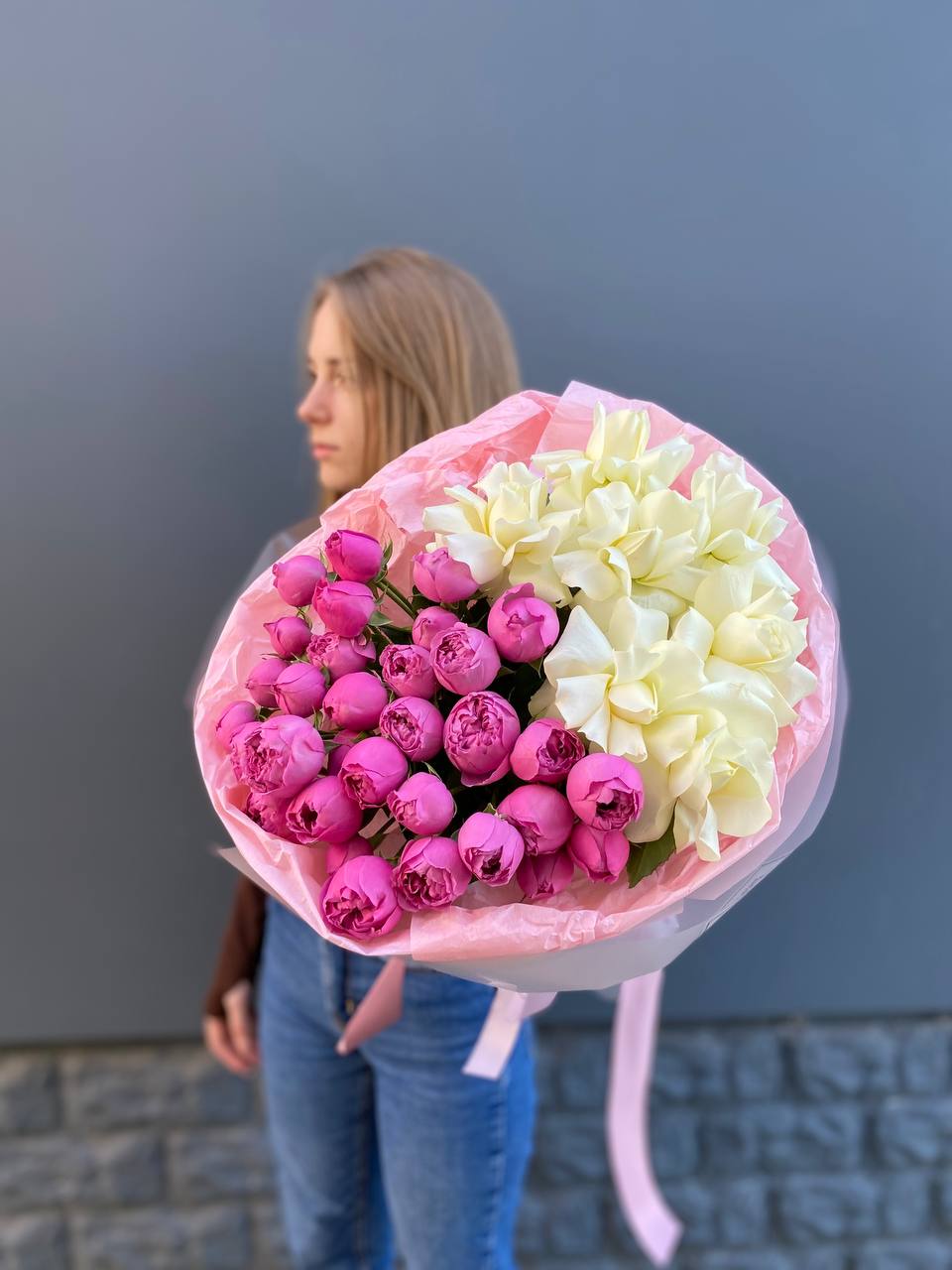 пионы, кустовые розы, озатамус , лента и дизайнерская пленка.