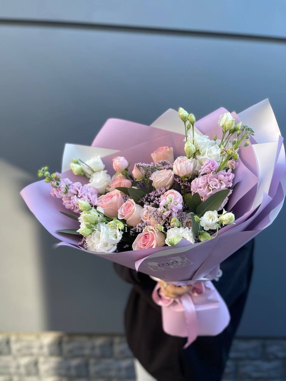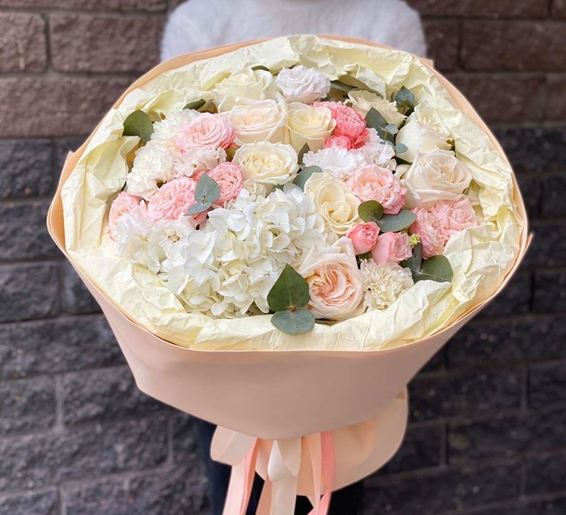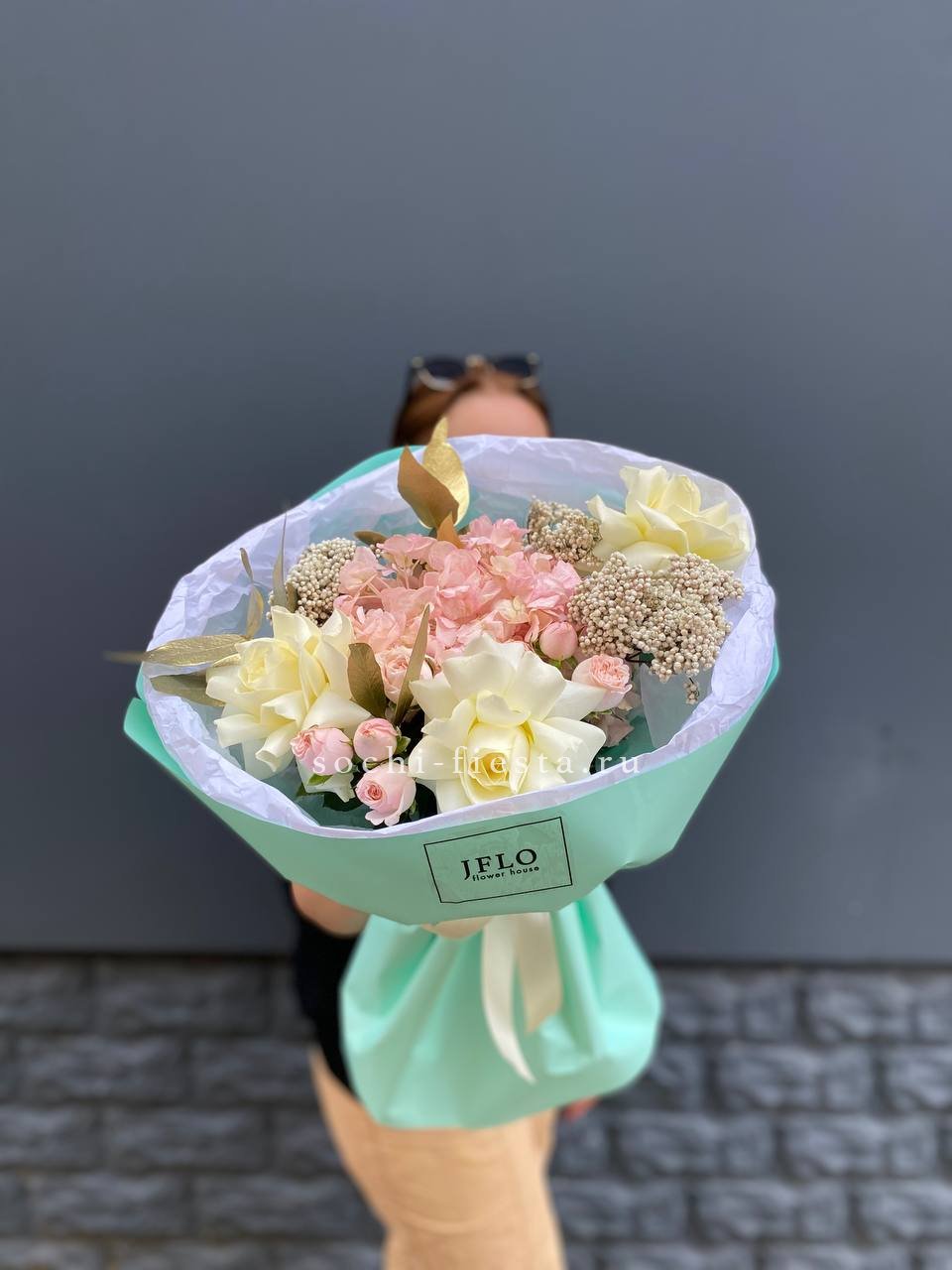 Воздушная гортензия окружена розовыми бутонами и душистой маттиолой. Лимониум добавляет букету лёгкую дымку, а общий силуэт остаётся мягким и собранным.