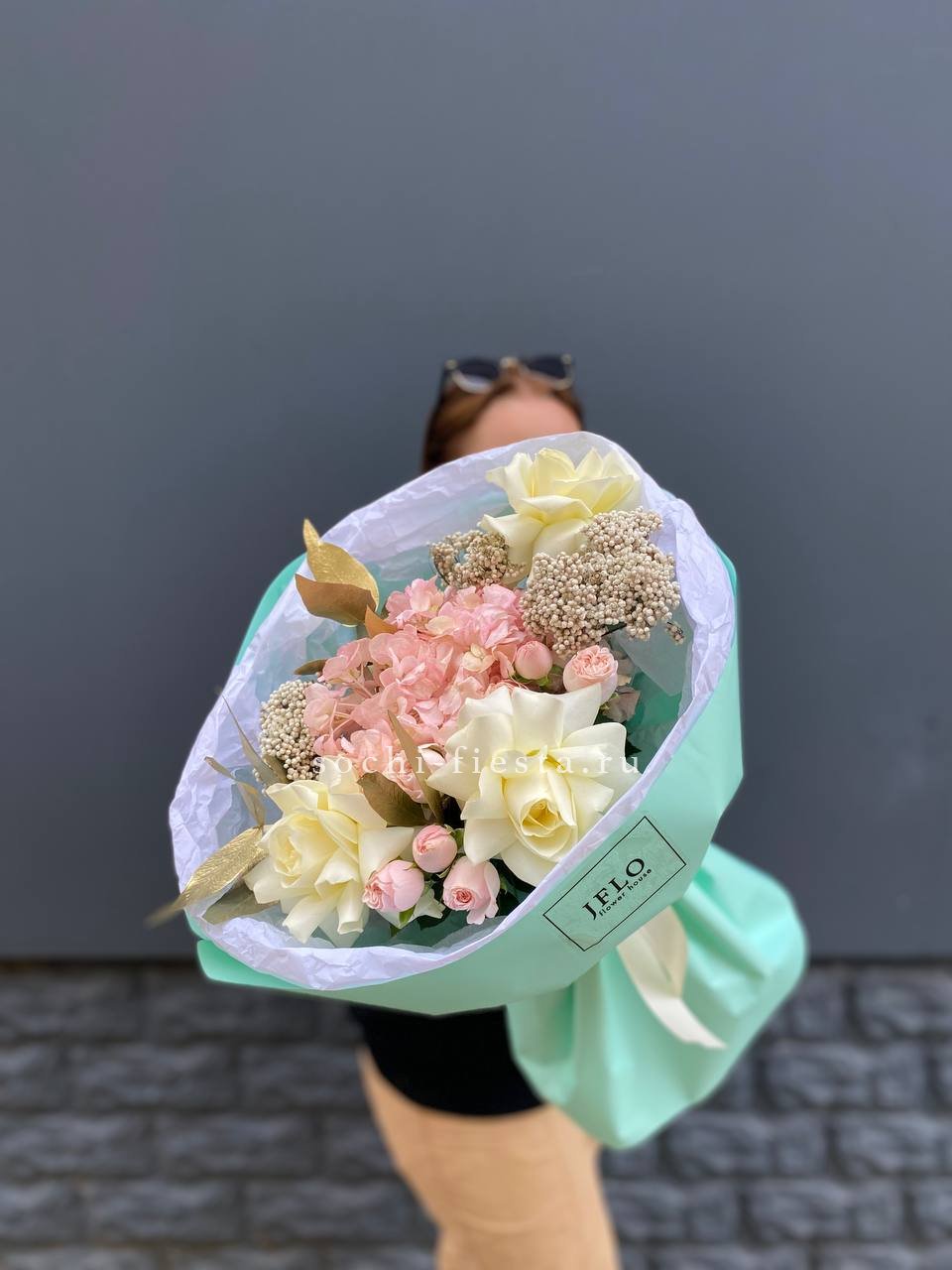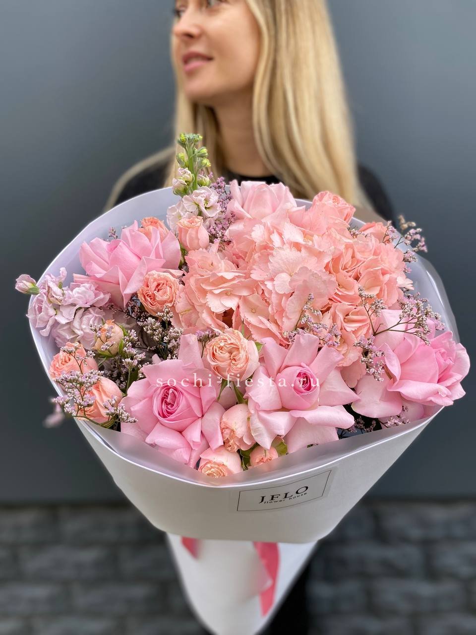 гортензия, розовые розы, кустовые розы, маттиолы,, лимониум лента и дизайнерская пленка.