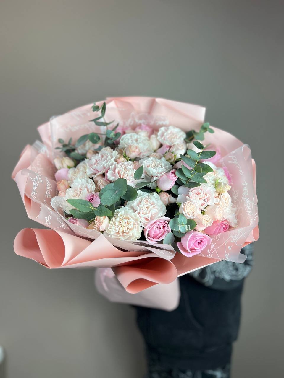 В центре внимания — фактуры и цвет! Современный, стильный букет, который сочетает бархатистые бутоны роз и мягкий хлопок. Это не просто цветы, а целая цветочная композиция для тех, кто ценит красоту в деталях. Отличный повод порадовать себя или близких!