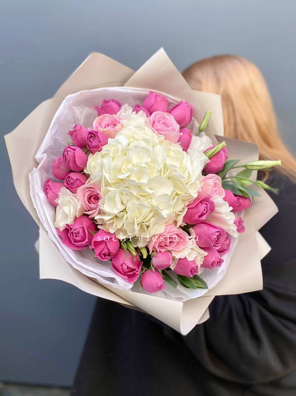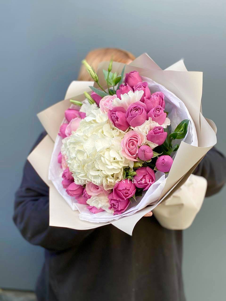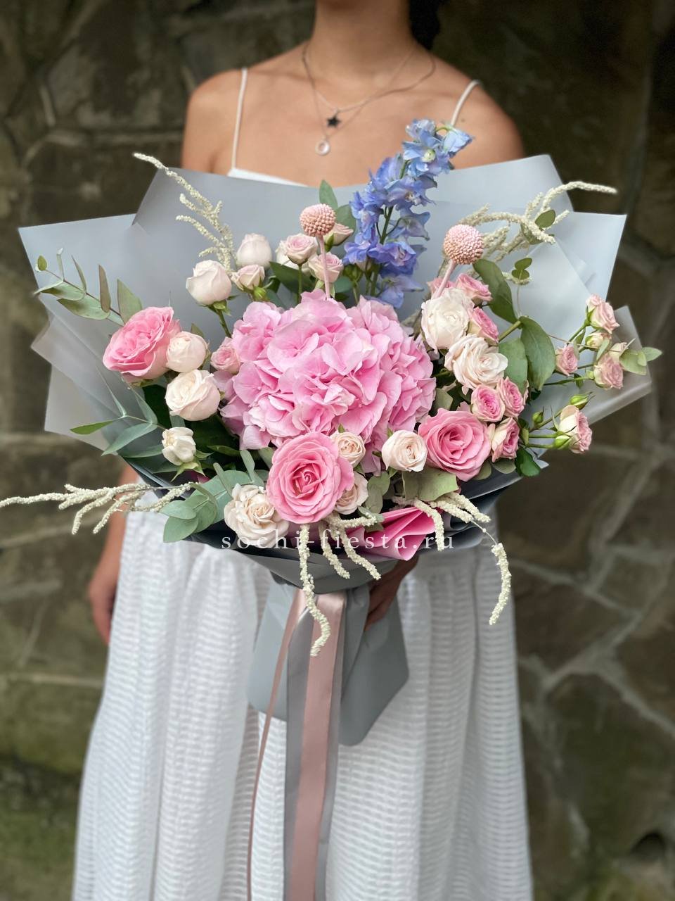 гортензия, кустовая роза, розовая роза, дельфиниум/маттиола/львиный зев, амарантус, эвкалипт или аналог, декор, корейская пленка, лента.