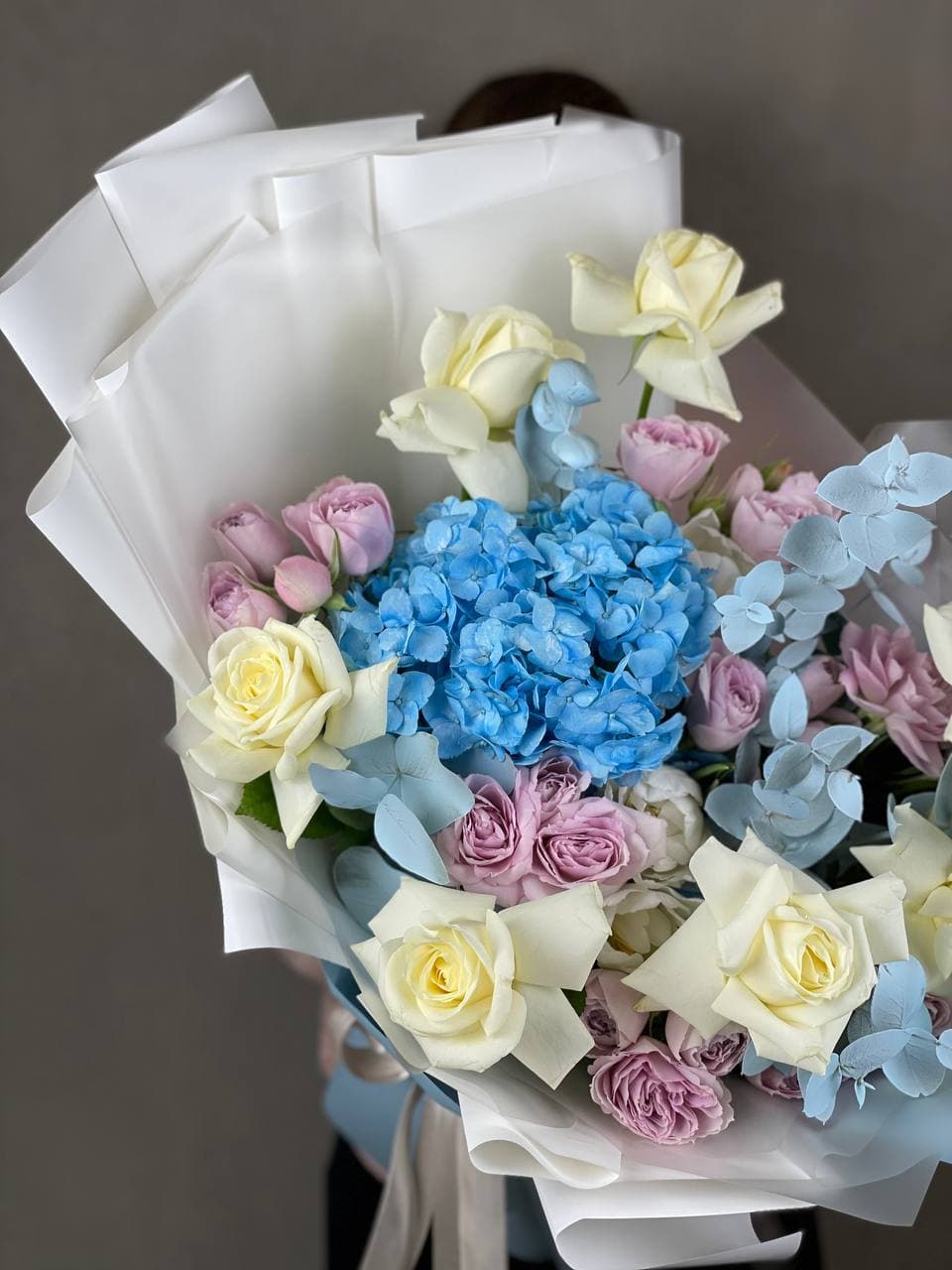 Прохладная палитра голубой гортензии и пионовидных роз в дизайнерском исполнении. Тюльпаны вносят весенний акцент, а эвкалипт завершает композицию мягкими линиями.