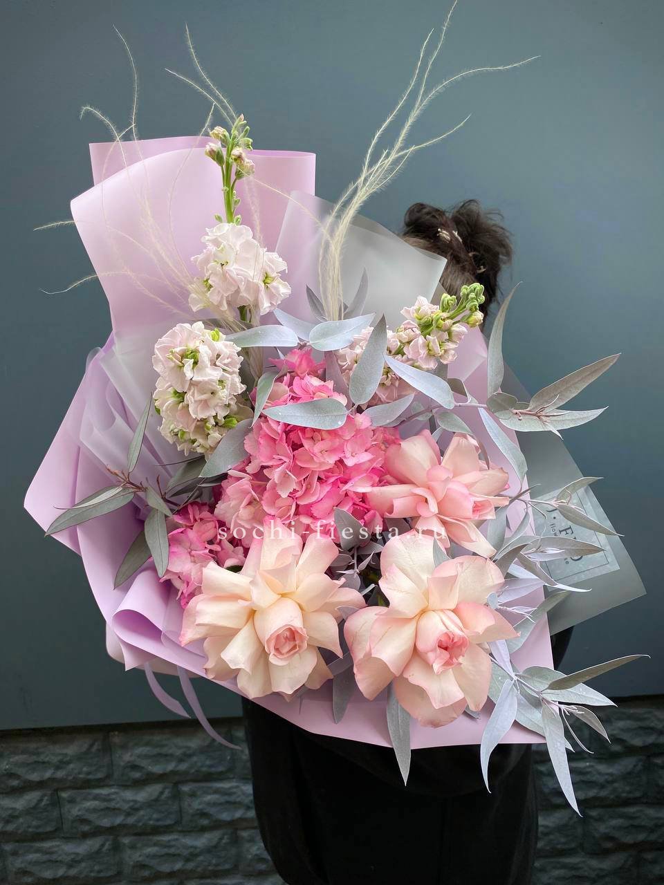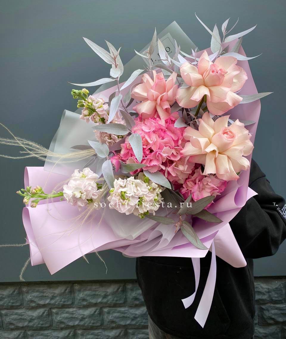 гортензия, пионовидные кустовые розы, орхидеи, нутан, протея, хамелациум, вспомогательная зелень, лента, дизайнерская упаковка.