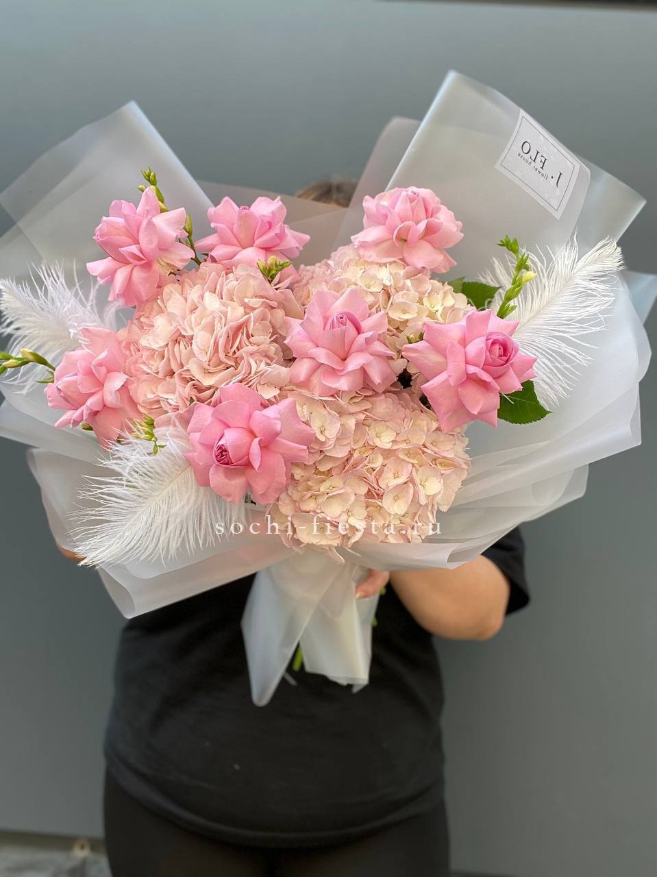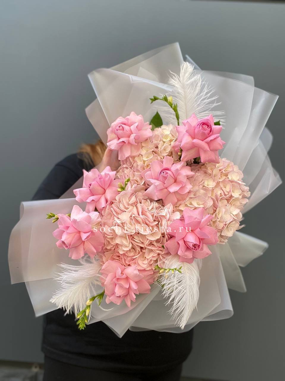 Светло-розовая палитра раскрывается от пудровых роз до свежих гербер. Бруния и аспарагус добавляют фактурные детали, а гортензия мягко завершает цветовую гамму.