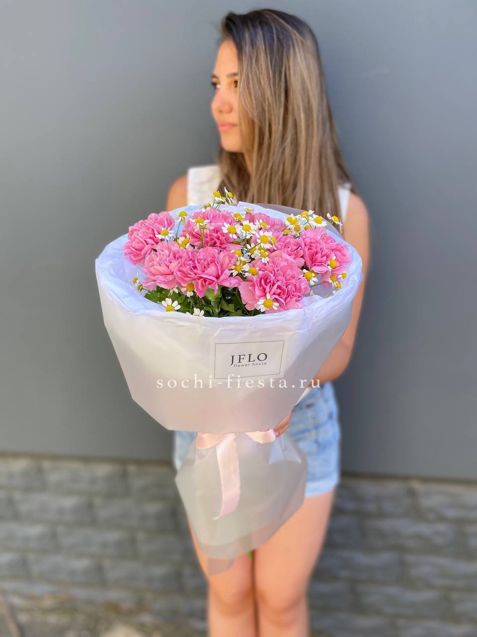 Два отдельных букета в одной композиции создают свободную асимметрию. Белые ромашки с открытыми серединками и пышные диантусы собраны так, что каждая часть читается самостоятельно, но вместе они держат общий ритм и объем.
