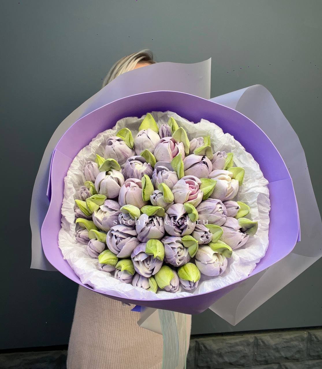 Фиолетовые тюльпаны из воздушного зефира собраны в объёмную композицию. Каждый бутон выполнен отдельно на яблочном пюре и пектине с натуральными красителями.